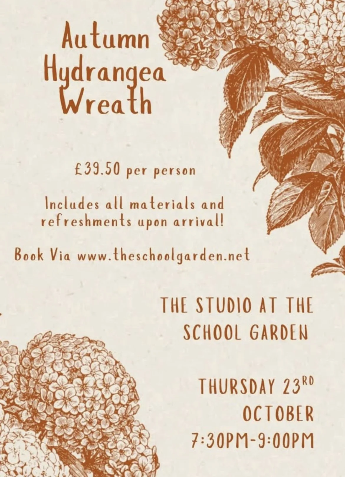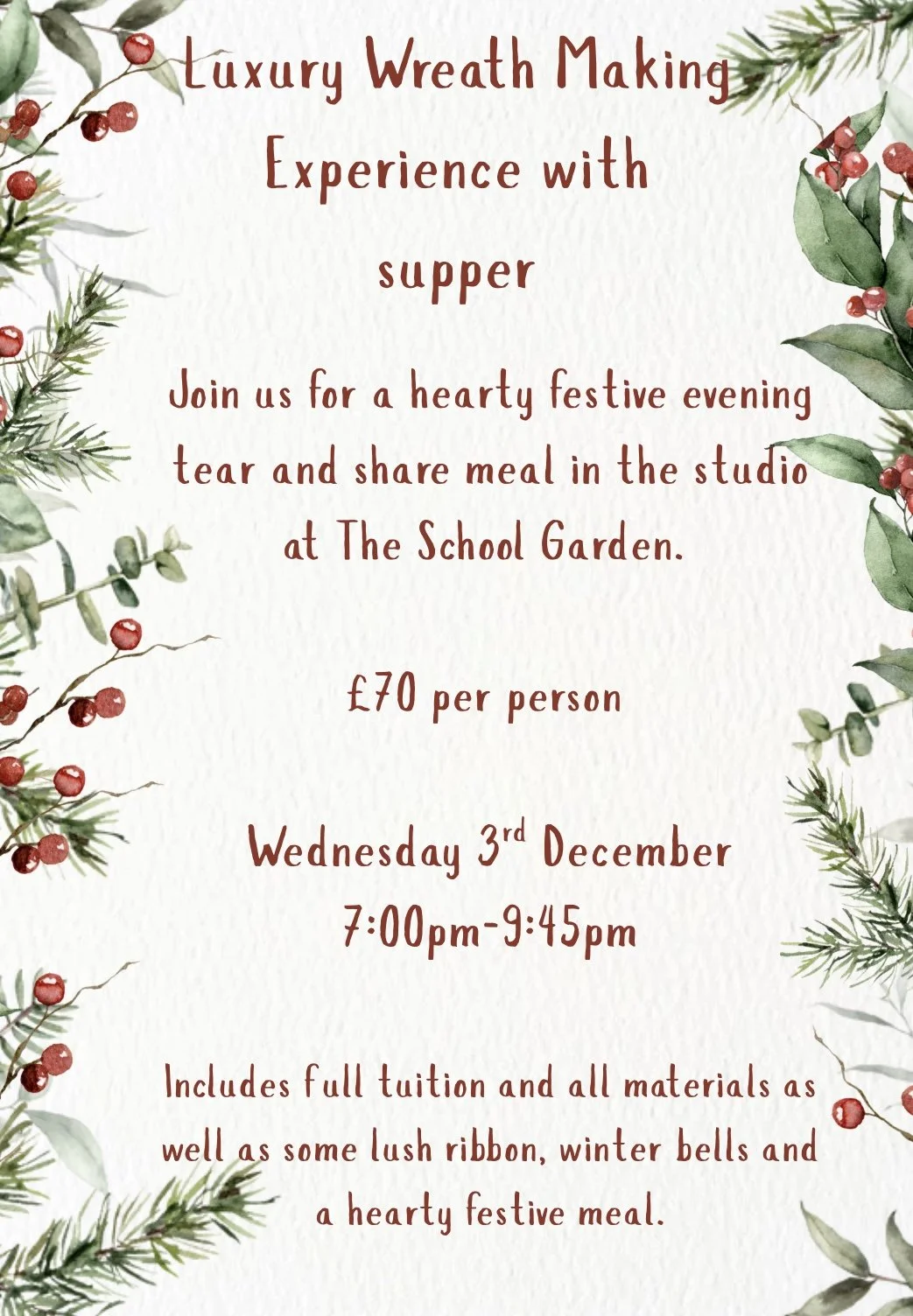 I have now been to 2 wreath making classes at The School Garden. A fantastic experience, from the warm welcome, excellent tutoring, through to the tasty nibbles provided. The best time , 100% recommend this to all.