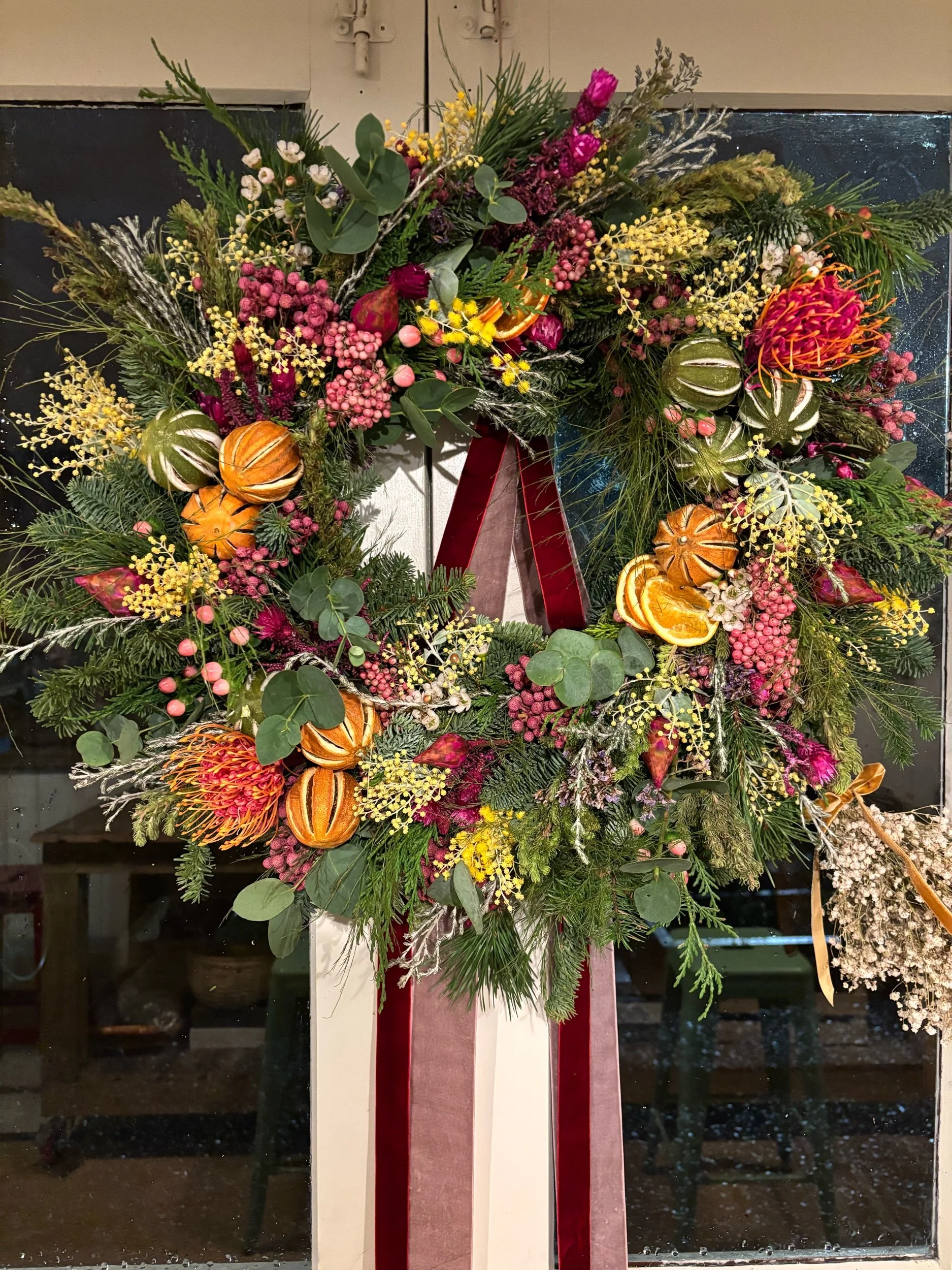 This wreath shouts JOY as your guests arrive for Christmas. On a Noble Fir, Pine, Eucalyptus and Sussex Silver base she is filled with Mimosa, Waxflower, Cirtrus fruits, Pink Pepper Berries, Hypericum Berries and more.